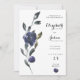 Dramatic and moody watercolored florals with leaves and blossoms in earthy tones of iris blue and purple, greys and mossy greens. A side spray of flowers adorns the left side, with contrasting serif type fonts and flourished calligraphy offsetting the edgy palette, perfect for weddings and parties. Contact us here for any custom changes and additions to the Woodsy Watercolor Floral range in Iris Blue that accompanies this unique hand-painted design.