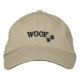 Show off the dog lover in you! This quality 100% cotton chino twill cap has the word WOOF embroidered on the front in black thread, along with two little paw prints, also embroidered in black.