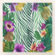 The picture shows a lively mosaic of lush Monstera leaves in lush green and yellow, combined with magnificent purple and orange flowers that stand out against a dynamic, wave-like background. It radiates a wild, tropical energy and a joyful abundance, which awakens curiosity and a natural connection.