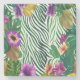 The picture shows a lively mosaic of lush Monstera leaves in lush green and yellow, combined with magnificent purple and orange flowers that stand out against a dynamic, wave-like background. It radiates a wild, tropical energy and a joyful abundance, which awakens curiosity and a natural connection.
