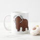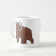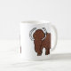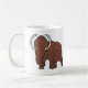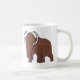 A brown woolly mammoth looks at the viewer. Has raised tusks, hairy coat, small eyes and ear and a large long trunk.