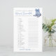 This game card features a pair of fancy blue cowboy boots adorned with a large watercolor bow. The boots are decorated with a floral or chinoiserie-inspired pattern, giving the design an elegant twist on rustic country charm. Perfect for a “Something blue before I do!” theme. A stylish mix of dark blue and grey fonts, combining handwritten script and classic serif typography for a polished, modern feel.