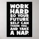 "Work Hard So Your Future Self Can Thank You... And Take A Nap" is a motivational statement for dreamers, hustlers, and achievers who understand the value of putting in the effort now for rewards later. This humourous yet inspiring design is ideal for individuals striving for personal growth, professional success, or ambitious goals. Whether you're pushing through a tough day or staying committed to your vision, this message serves as a daily reminder that every effort today builds a better tomorrow. Great for entrepreneurs, students, and anyone with a relentless drive to succeed.