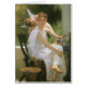 Work Interrupted (1891) by Bouguereau is a vintage Victorian mythology fine art realist portrait painting. A woman sitting on a chair with an angel. The cherub is whispering secrets in her ear.