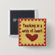 This pin would make a nice teacher thank you gift. It features red and yellow colours, a heart and the words "Teaching is a work of heart".