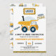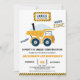 Any age under construction birthday invitation featuring a large dump truck, signs and yellow and black striped pattern. This under construction birthday invitation is ideal for a boys first birthday.
