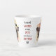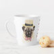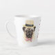 Here's the perfect latte mug for the Pug owner! At each side is a portrait of a cute Pug. One is wearing a sombrero style hat, and red sunglasses. The other is wearing a dapper man's hat, and a red and white striped bow tie. Between the images is black and red text that says "I work HARD so my PUG can have a BETTER life". Cute!