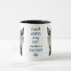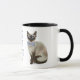 Here's the perfect latte mug for the Siamese cat owner! At each side is a portrait of a blue eyed Siamese cat wearing glasses and a blue bow tie. Between the images is black and blue text that says "I work HARD so my CAT can have a BETTER life". Cute!