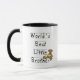 A teddy bear with a big yellow pencil and lined paper type kid style text that reads "World's Best Little Brother" on little brother T-shirts, mugs, tote bags, sweatshirts, buttons, and other items.