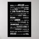 Black and white poster with names of famous World cities.