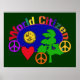 A colourful rainbow design of peace symbols to protest against war, a tree and sun to save the planet's resources, and a heart to love one another ties in the words: "World Citizen."