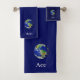 World globe and text on navy blue Bath Towel Set. Text can be personalised. Text only on one side!