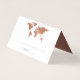 Sophisticated ginger bonze copper faux foil world map place card for a modern and industrial destination wedding or travel theme party, with editable background colours to match your globetrotter-inspired event. Add message inside if needed. Coordinating wedding and party day stationery can be found in the Custom Paper Works Zazzle Designer Shop.