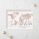 Romantic destination wedding save the date with an elegant watercolor world map in whimsical neutral tan brown and grey for a subtle and understated look features a moveable heart location pin that you can move to anywhere on the globe. Just click ‘customise’ and select the layer to edit the place of the heart. Many other colours and travel theme wedding save the date cards can be found in the Paper Grape Destinations Zazzle Invitation Designer Shop.