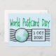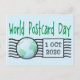 World Postcard Day is October 1. This is a special day to promote and celebrate the exchanging and collecting of postcards. This design features a postal indice stamp graphic with a small earth globe map and the date as a sent date.