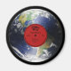 A photo of the Earth depicted as a vinyl record. Seven tracks are etched on the surface, one for each continent. A red label in the centre has text saying "Milky Way" "World Record" and "Eastern and Western Hemispheres property of the Earth. Made in the Solar System". Also includes a tracklist with the names of the 7 continents.
