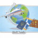 World Traveller, popular design with aeroplane, tickets, passport, and luggage.