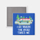 I go where the road takes me. A beautiful road trip RV Camper quote for a tourist or nomad who loves to travel around the world camping and visiting places. It features a cute motor home in front of a forest of trees and mountains.