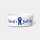 This pet bowl has a number one blue ribbon against a white background and the saying World's Best Dog.