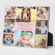 Give the world's best grandma an elegant custom multi-photo collage plaque that she will treasure for years. You can personalize with eight photos of grandchildren, children, other family members, pets, etc., personalize the expression "World's Best Grandma" and whether she is called "Grandma," "Nana," "Granny," etc., and add her grandchildren's names, all in light grey typography against a pink background.