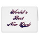 Navy blue edged with red baseball style text reads "World's Best New Dad" on new dad T-shirts, mousepads, mugs, cards, stickers, keychains, and much more!