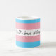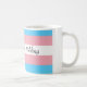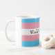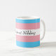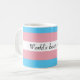 Image description [ A partially white mug, with the trans flag in pink, white and blue wrapped around it. The words 'World's best Nibling' are written in black ink on the white stripe in the middle of the flag']