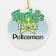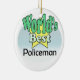 Fun gift and surprise for the world's best police officer! Depicted on an ornament with a star. Colors: green, yellow, blue, and white.