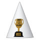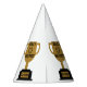 These party hats features the words "World's Greatest Father" displaying a yearbook bold print font with black letters plus a winners wreath with number 1 in the centre over a golden coloured flat style cup trophy on a black base in this Father's Day theme. All paper hats have an attached elastic string printed in full vibrant colours made in the USA has a Minimum of 12 order requirement.