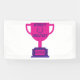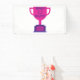 This banner features the words "World's Greatest Mother" displaying a yearbook bold print font with purple letters plus a winners wreath with number 1 in the centre over a pink coloured flat style cup trophy on a purple base in this Mother's Day theme. This banner has single side printing outdoor safe measures 1.6"x3" made with an elegant matte finish and is both fade and tear resistant for Indoors or outdoor use great for advertise anything, from birthdays to graduation, weddings to anniversaries. Hemmed and thermally welded edges for neat finish outdoor banners can be bought with metal grommets.