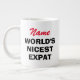 World's Nicest Expat funny large jumbo size Giant Coffee Mug. Cute personalised black and white cup for home or office. Fun Birthday gift idea for expat, friend, coworker, boss, colleague, teacher, manager, employee, staff, personnel etc. Add your own name.