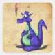 A cute cartoon of a purple and green dragon with a most worried look on it's face. A great design for children or just those that are young at heart.