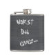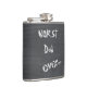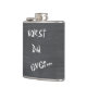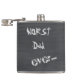The flask itself is fine. It’s a cheap flask, obviously bought in bulk, however am prepared to overlook that. Given that it is a personalized item, I would have liked to have seen gift boxing instead of the generic packaging. Terrible printing, and/or quality. It’s a cheap, tacky vinyl. It is not cut straight and is also applied in a way that it is overhanging the bottom, causing the glue to catch on items and it will eventually roll and tear, damaging the wrap.