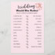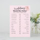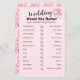Add excitement and laughter to your bridal shower, bachelorette party, or wedding celebration with this Wedding "Would She Rather?" game! Guests will have a blast guessing the bride-to-be’s preferences—does she love beach resorts or glamping, chocolate or vanilla, staying home or dancing till dawn? Designed with a playful pink and red layout featuring elegant engagement ring accents, this game is easy to play and perfect for bride-to-be parties, couples' showers, and wedding festivities. A must-have for creating fun memories before the big day! Customisable - add your personal spin for your upcoming event!