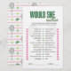 Add fun and laughter to the celebration with this Would She Rather bridal shower game card, designed as a full-page paper game sheet. Guests will guess which option the bride-to-be would choose by placing a tick next to their answers. Featuring a charming tennis-inspired design, this game is perfect for tennis lovers, sporty brides, country club bridal showers, engagement parties, and wedding showers. The clean, easy-to-read layout makes it simple to play, while the coordinating tennis pattern on the back adds a polished, professional finish. Ideal for modern, elegant, and themed bridal celebrations.
