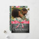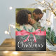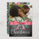 Festive holiday photo card features your favourite images adorned with a red watercolor ribbon bow illustration and green pine boughs. "Merry Christmas" appears beneath in white lettering on a rustic chalkboard background. Personalise with your names and the year.