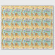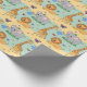 Wrapping paper featuring a playful pattern of cartoon animals, including lions, elephants, and giraffes, on a pastel yellow and blue background. The image shows both an unrolled and flat sheet, evoking a cheerful and whimsical tone.