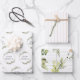 Wrapping featuring a minimalist watercolor wreath with red floral and green foliage accents. This elegant wreath frames the greeting "Merry Christmas". 2nd sheet is a gold pin-stripe pattern. 3rd sheet is watercolor greenery with a sage pin-stripe in the background.