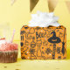 Wrapping Paper with a modern minimalist design for Halloween, a pattern of silhouettes of skulls, ghosts, cobwebs, a silhouette of a cat, pumpkins on an orange background.
