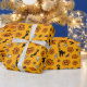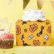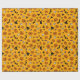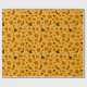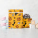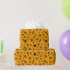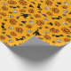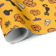 Wrapping Paper with a modern minimalist design for Halloween, a pattern of silhouettes of skulls, ghosts, cobwebs, a silhouette of a cat, pumpkins on an orange background.