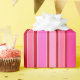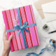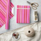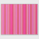 This wrapping paper is shown in a multi color Pink and Red stripes print.