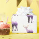This gift wrapping paper is shown in white with a heard of purple-plum to tan elk/deer with their antlers. repetitive print.