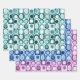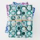 wrapping paper in repeating pattern of abstract squares and blobs in solid colours teal blue magenta