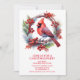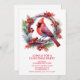Wreath and cardinal party invitation in red for a festive Holiday party.