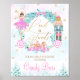 Sweet Nutcracker themed land of sweets birthday invitation featuring a nutcracker from the Nutcracker ballet, the Sugar Plum Fairy, some faux gold decorative text, some candy, a winter wreath and snowflakes. This land of sweets birthday party sign is a cute addition to a Nutcracker, land of sweets girl's birthday party.