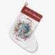 This stocking features a beautiful Christmas floral wreath decorated with red berries and green leaves. At the centre of the wreath is a treasured photo of the baby, capturing a special moment. The baby's name is stylishly placed above the picture, highlighted by cute dots on either side. Below the photo, the year is noted, marking this important occasion. The top of the stocking is finished with a red border and the phrase 'My First Christmas'.