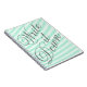 A notebook with a lovely script font for all those things you need to write down and hold on to. Shown here with an aqua and white striped background and grey font colour.