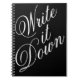 A notebook featuring large script text "Write it Down" for all those things you need to write down and hold on to. Shown here with a black background, you can change the background colour to the colour of your choice by selecting the "customise it" button and selecting another background colour.