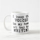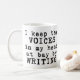 Coffee mugs in several designs, colours, and sizes with the reminder "I keep the voices in my head at bay by writing", Good gift for suthors, poets, playwrights, and other writers, published or aspiring.