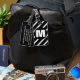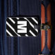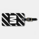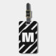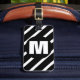 luggage tag with leather strap: black bubble framed monogram on white diagonal striped background
