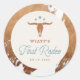 This rodeo themed first birthday sticker features a brown watercolor cow print background with burnt orange and teal western graphics and a rodeo font. Pair with anything in the WYNONA Collection for the complete party look!